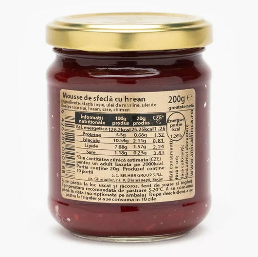 Cu un gust și o aromă inconfundabilă, mousse-ul de sfeclă cu hrean este un produs foarte apreciat. Produs fără conservanți, fără E-uri, fără coloranți, fără aditivi alimentari, pentru a păstra aroma neschimbată. Un produs, gustos și savuros făcut pe cuptoare ce funcționează cu lemne, din legume atent selecțioante.