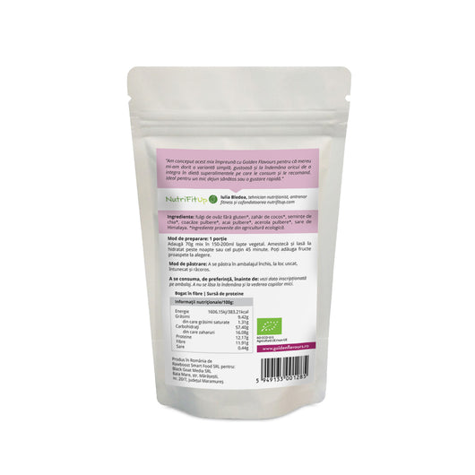 Ingrediente: fulgi de ovăz fără gluten*, zahăr de cocos*, semințe de chia*, coacăze pulbere*, acai pulbere*, acerola pulbere*, sare de