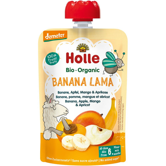 În acest pachetel se ascund doar fructe delicioase. Piureul Holle de banane, mere, mango si caise ofera celui mic o experienta de gust în lumea fructelor, datorita continutului de 100% de piure de fructe, obtinut prin respectare retetelor de la Holle, rezultând astfel un portofoliu diversificat de sortimente de piureuri. Acest piure este o gustare de seara ideala, îl puteti folosi în faza de alimentatie complementara sau când va aflati pe drum cu cel mic.